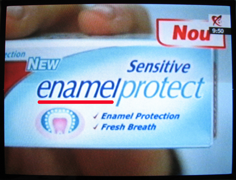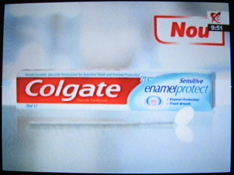 Intr-o dimineata n-am ce face si ma ascund dupa canapea cu aparatul foto in stand-by. N-a trebuit sa astept nici un sfert de ora... La un moment dat, in jur de ora 10, "animalul" isi face aparitia imediat dupa alte jivine, lupii spotului CEC "Prima noastra casa". Pac-pac! Am tras cateva shot-uri si l-am capturat. Surpriza! Pasamite, "animal"-ul celor de la Colgate era, de fapt, un "enamel", "enamel protect".