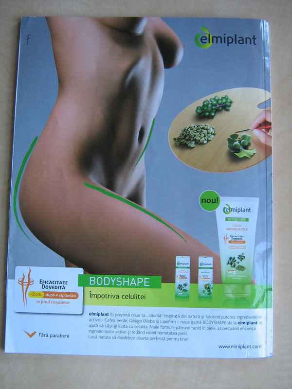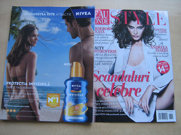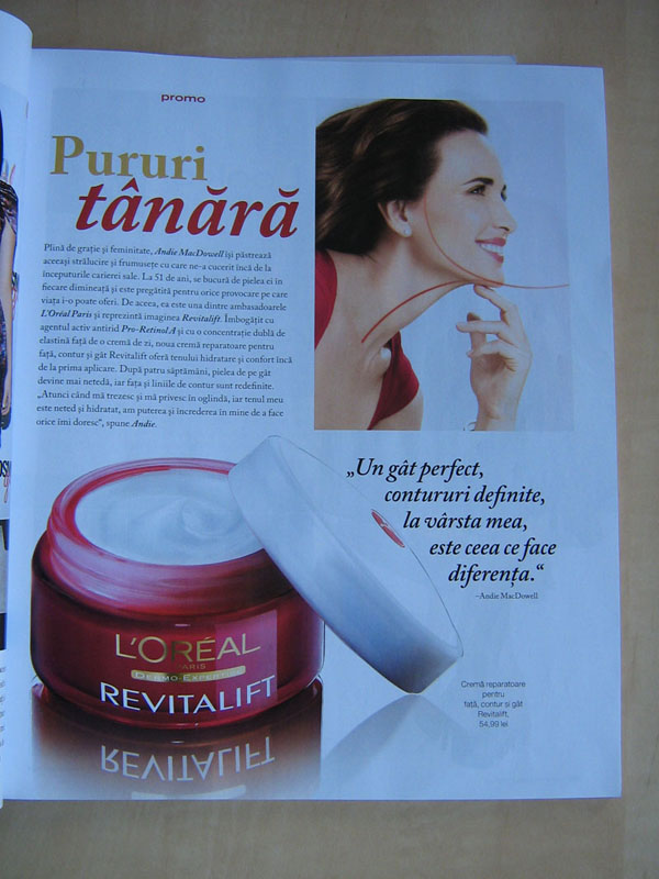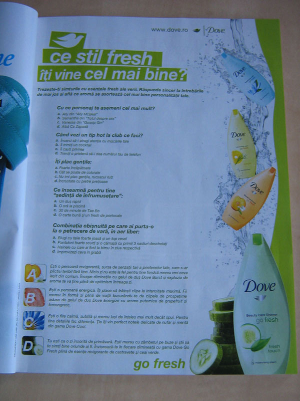 Am investigat un pic cum isi gasesc locul aceste activari ale produselor de beauty printre editorialele militante, articolele cu feeling si coloanele de tips pentru viata de cuplu. Variantele sunt multiple: advertoriale marcate ca atare, ad-uri de presa cu o imagine sugestiva si doua vorbe sau, dimpotriva, ad-uri cu multe cuvinte incat aproape le confunzi cu pagini obisnuite ale revistei... si sa nu uitam de "editor's choice" zona cea mai safe pentru ca promovarea produsului sa nu fie foarte agresiva pentru ochiul cititoarelor dornice sa gaseasca solutii miraculoase pentru cine stie ce imperfectiuni ale corpului. Sa le luam pe rand.