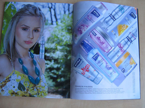 Tot la capitolul hairstyle, Bolero din iulie face un pictorial dedicat Nivea, prezentand coafuri pentru diverse ocazii si stari: de la Femme Fatale, la Bellisssima sau Greek Goddess, cu explicatii privind produsele Nivea folosite, inclusiv pretul. Tot pe principiul sa comunicam in stilul glossy, gelurile de dus Dove din gama Go Fresh se promoveaza in numarul estival al Beau Monde inserand pe langa mostra de rigoare si un test despre "ce stil fresh iti vine cel mai bine". Tot acolo apar si patru pagini cu poze si povesti despre concursul de hairstyling organizat de L'Oreal Professionnel.