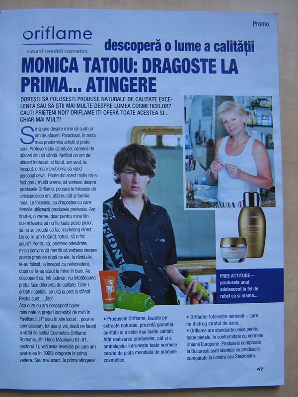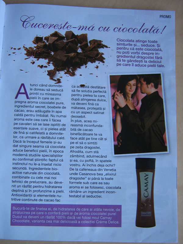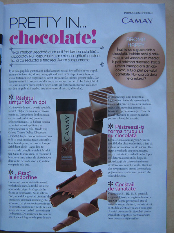 In numarul din august al revistei Cosmopolitan apare un promo pentru gelul de dus Camay cu aroma de ciocolata. E scris in stilul Cosmopolitan si destul de diferit de advertorialul aparut in Joy pentru acelasi produs. Aici, sub eticheta discreta "promo" apare o poveste despre seductie in care este promovat gelul de dus Camay cu aroma de ciocolata. La o pagina distanta, tot in Joy, ca un reportaj despre o femeie de afaceri apare povestea Monica Tatoiu care vorbeste despre produsele Oriflame cu autoritatea unui expert si naturaletea unei consumatoare.