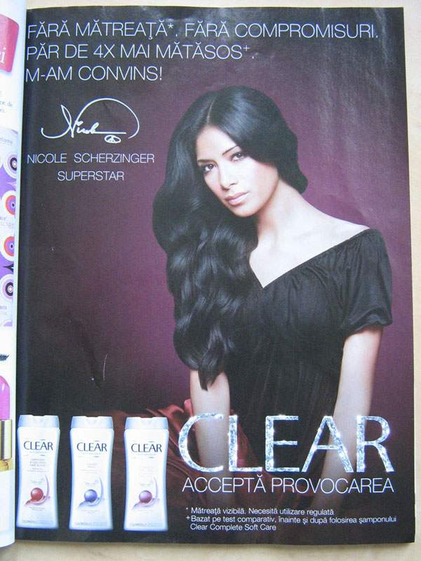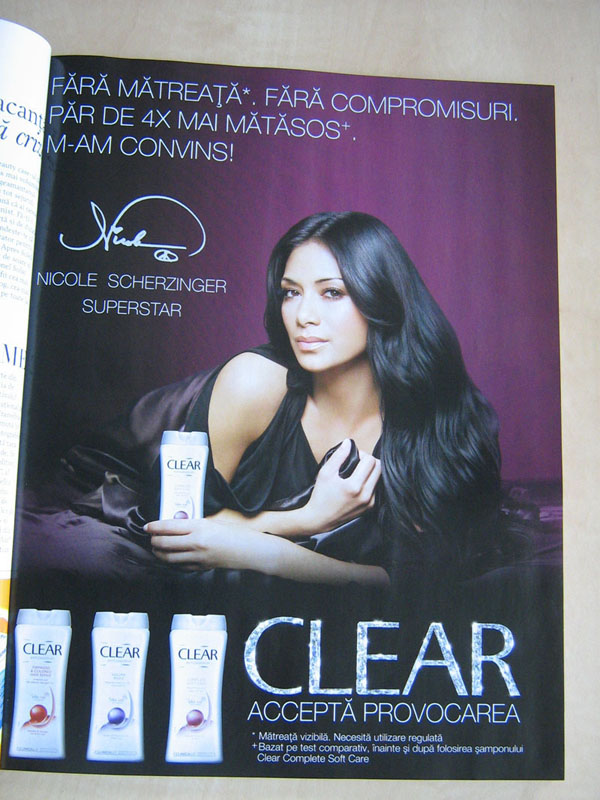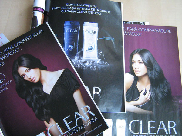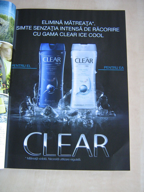 Dincolo de faptul ca "viitorul iti surade" prin spread-ul Avon cu Reese Whitherspoon care promoveaza noua Mascara Spectra Lash, dincolo de masca de fata de la Oriflame de pe coperta trei sau de crema anticelulitica de la Elmiplant de pe coperta patru, iti ia ochii bling bling-ul de pe pagina Clear. De altfel, revista s-a vandut cu mostra de sampon. Ar mai fi de pus pe lista crema Oxyance destinata mentinerii unui ten sanatos intr-un mediu poluat. Printre randuri, putem citi argumentul ca respectivele produse te ajuta sa ai grija de sanatatea ta si nu numai de frumusete; un mesaj potrivit pentru targetul revistei.