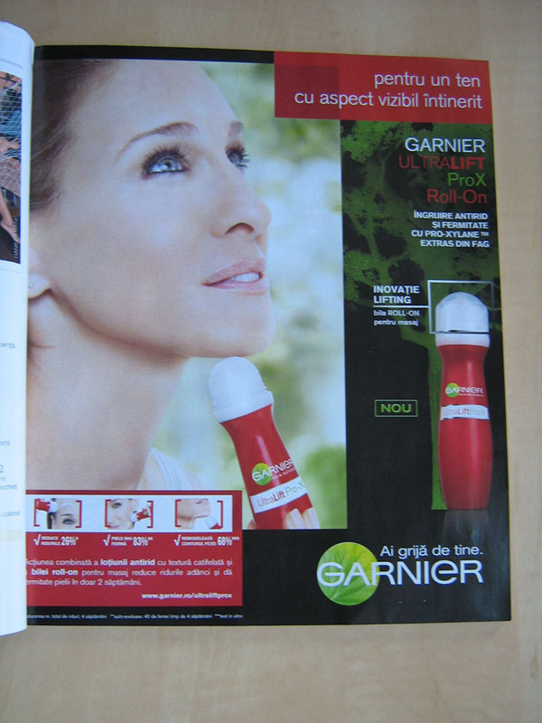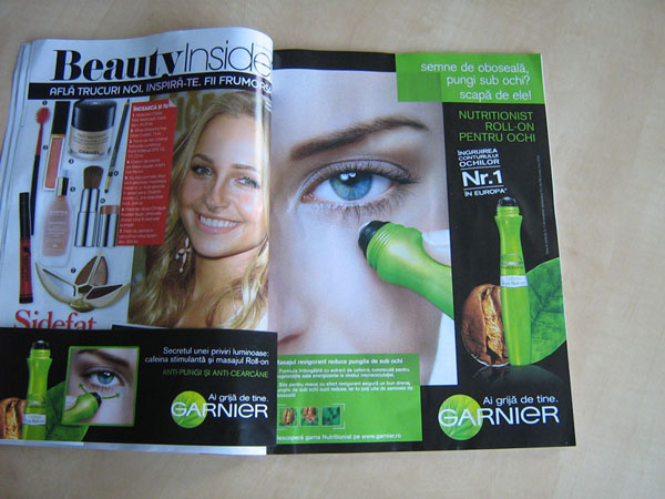 In plus, pentru femeile active, Garnier propune o solutie pentru eliminarea pungilor de sub ochi. Ba mai mult, printr-un semn ingenios bine plasat, revista se deschide direct la pagina cu pricina.