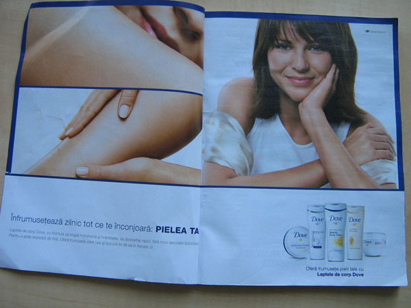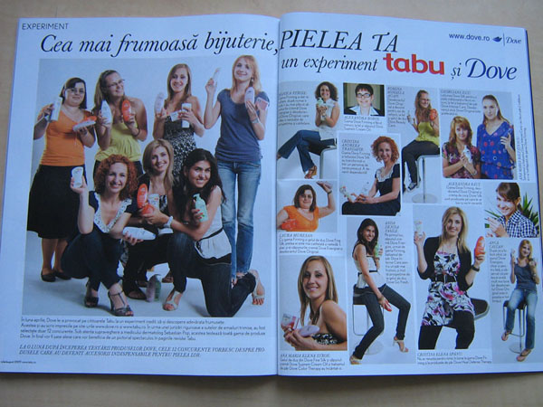Si pentru ca "Cea mai frumoasa bijuterie e pielea ta", Dove si TABU au pus la cale un experiment in lunile iulie-august: doua pagini de testimoniale de la consumatoarele Dove, cu product placement inclus in poze.