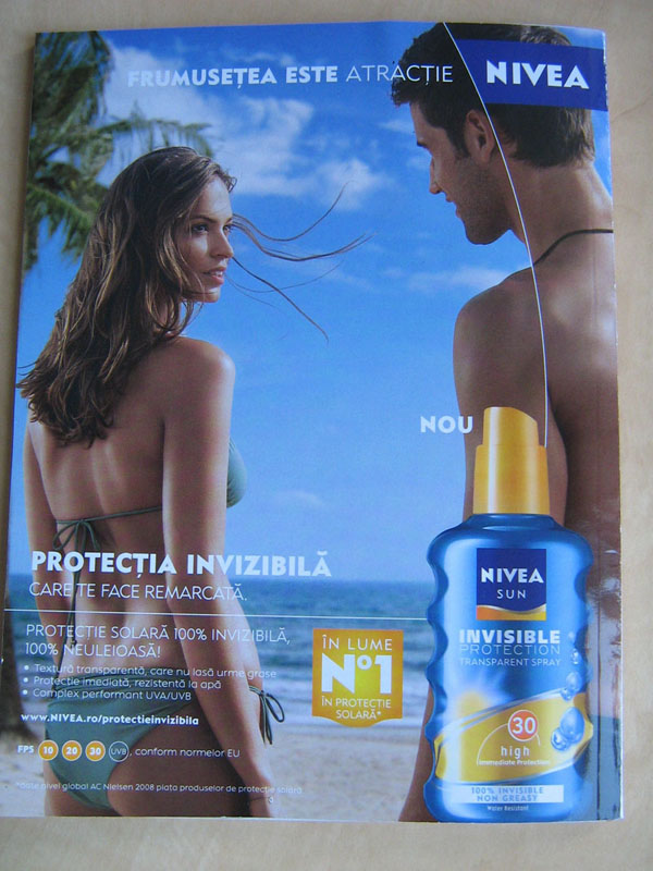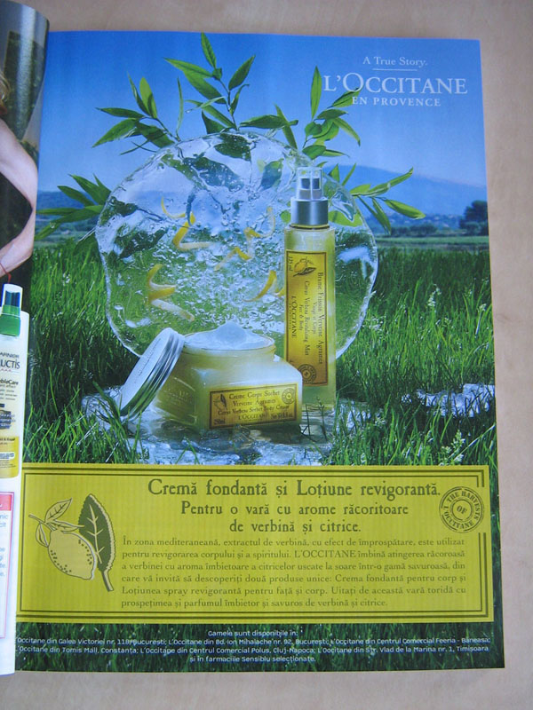 Reclamele pentru produse de ingrijire a pielii adaptate sezonului estival sunt in ton cu pictorialele cu rochite inflorate si recomandarile de costume de baie. In Beau Monde iulie-august, crema L'Occitane imbie cu "arome racoritoare de verbina si citrice", ca antidot pentru canicula. Ad-ul Nivea (pe care il gasim aproape peste tot prin revistele glossy ale acestei veri) spune si el o poveste, de data aceasta fara cuvinte, doar din priviri. E putina magie acolo, trebuie sa recunoastem.