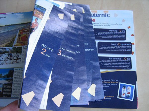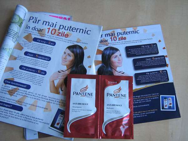 In numarul Joy din august gasim machete publicitare cu mai multa imaginatie: un spread de la crema de corp Dove care vorbeste despre frumusetea naturala, advertorialele pentru gelul de dus Camay si produsele Oriflame, despre care am vorbit deja, si un teaser de la samponul Pantene. O banda verticala pe marginea catorva pagini consecutive arata ca e nevoie de mult timp pentru a obtine rezultate multumitoare, indiferent ca e vorba de "par lung - 2 ani" sau "rochia perfecta - 3 saptamani" etc., in schimb pentru un par puternic e nevoie de numai 10 zile si de samponul Pantene. Nu e chiar ca si cum efectul s-ar face simtit "peste noapte", dar nici cu viteza melcului, ce-i drept.