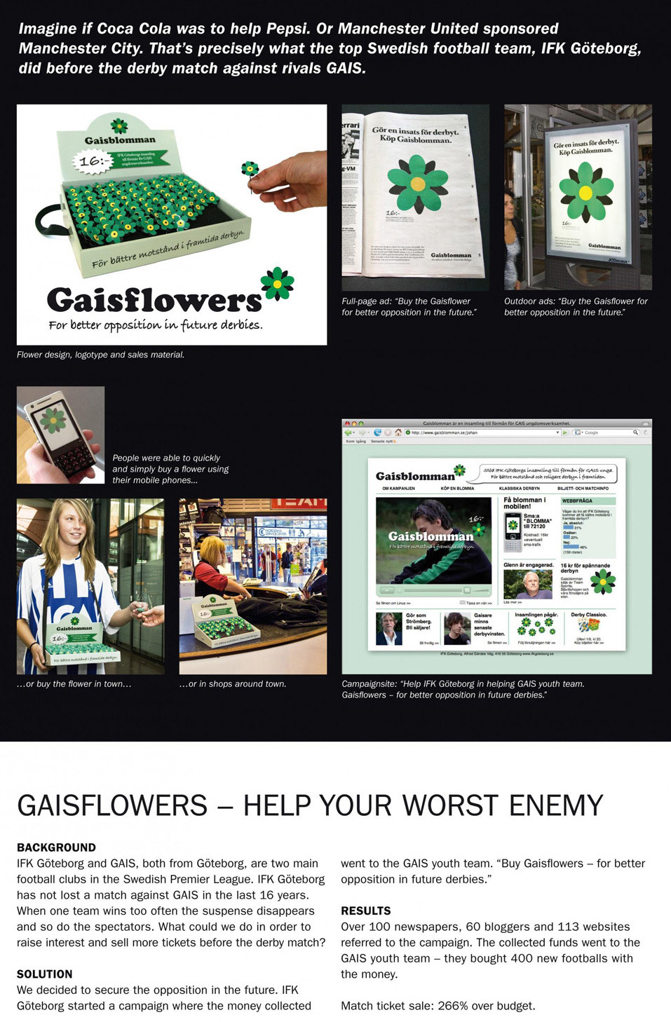 Neinvinsa de 16 ani de zile, echipa IFK Göteborg a organizat o strangere de fonduri pentru juniorii adversarei din acelasi oras, GAIS. Insigne in forma de floricele in culorile clubului GAIS au fost puse la vanzare pentru 1,5 Euro, in numele unor derbiuri viitoare mai bune. Atat de varza e echipa actuala incat singura sansa de a avea o competitie reala pentru IFK e ca generatiile viitoare sa descopere cum se joaca fotbal de fapt.