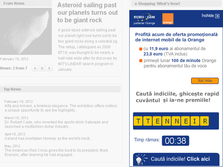 Adrian Stanescu: A fost primul banner din Romania cu 2 landing page-uri. Incepea jocul si daca voiai un hint si dadeai click la inceput, te ducea intr-un landing page in care erau cuvinte subliniate. Daca gaseai cuvantul, terminai jocul si dadeai iar click pe banner, te ducea in alt landing page, unde era un formular in care iti lasai datele de contact. In functie de faza in care erai in banner, te ducea in alta parte. Durata era de 36 de sec iar dwell time-ul de un minut si ceva.