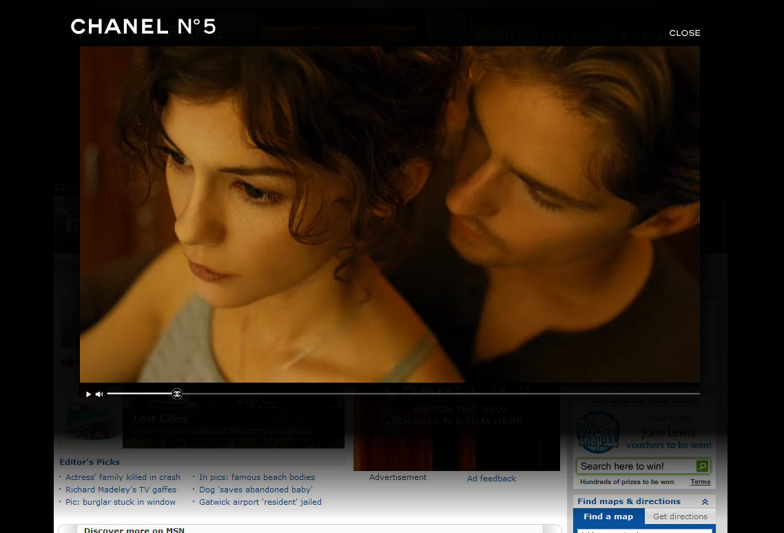 Adrian Stanescu: Channel no5. E tot un homepage takeover, am un floating care sta doar 2-3 secunde, sa-mi atraga atentia, apoi am bannerul de site cu push down content.