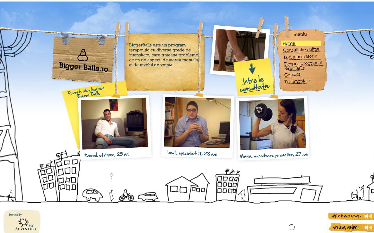 Am inventat-o pe Doctorita Bursuc, care verifica "how big your balls are", in functie de raspunsurile pe care le dadeai la testul de pe site. La sfarsitul testului, in functie de cat de mari erau, iti facea niste recomandari de tratamente: fie sa sari cu parasuta, fie sa mergi cu avionul etc, chestii care erau de fapt produse oferite de agentia de turism. Dupa ce am implementat finalitatea, am si branduit site-ul cu "powered by My Adventure", iar recomandarile doctoritei erau legate de ofertele de pe site-ul agentiei.