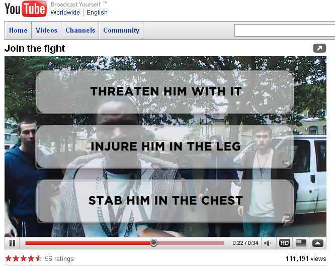 In cazul in care reuseste sa nu ia cutitul niciodata si sa se fereasca de necazuri, alegand sa mearga acasa la un prieten sau la o petrecere, privitorul e rasplatit cu un videoclip hip-hop care n-are legatura cu nimic. Un deliciu in acest caz sunt comentariile: