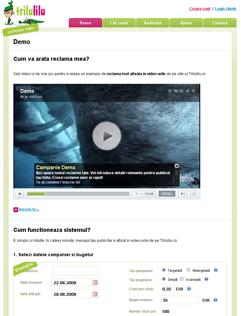 IQads: In sectiunea de publicitate de pe Trilulilu, publicitate.trilulilu.ro, sistemul CPC este descris ca fiind ideal pentru bugetele mici de publicitate online; plata pe click depinde de cat de complexa e targetarea, iar pretul minim pe click este 0,25 EUR. Care e creditul minim de la care iti poti seta o campanie? Crezi ca va avea si o functie de educare a pietei, in sensul folosirii unor bugete de test, pentru a se convinge de eficienta publicitatii video?