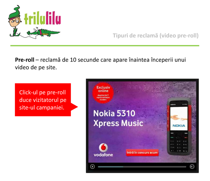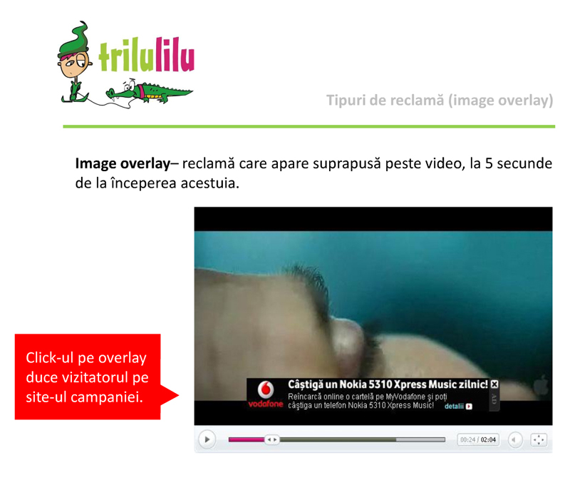 IQads: Aveti un studiu de caz (http://bit.ly/vadafonetrilu) din martie 2009 pentru o campanie Vodafone pe Trilulilu, care viza marirea numarului de useri pe myvodafone.ro si al clientilor noi care isi reincarcau online cartela Vodafone. Rata de click a fost de 3% pentru video preroll si de peste 1.3% pentru image overlay. Am vazut ca si Irina Bucurenciu (Online Campaign Manager, Vodafone) s-a declarat multumita de rezultate. Intrebarea e cum ati convins-o pe Irina/pe cei din McCann care se ocupa de media buying sa va includa in media plan si cum ati colaborat pentru alegerea formatelor de ad-uri care au rulat?