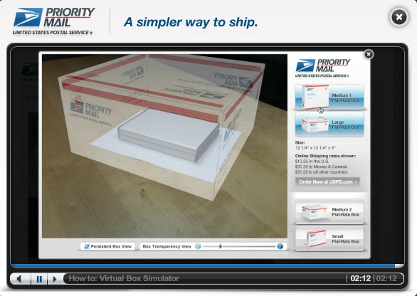 Pentru serviciul "Priority Mail" de la United States Postal Service, a fost folosita aceasta tehnica pentru ca utilizatorii sa poata alege cutia potrivita pentru obiectul pe care voiau sa-l trimita. O pagina cu trackerul asezata pe birou devenea suportul cutiei virtuale, care putea fi privita pe ecran. Produsul care urma sa fie impachetat era asezat pe foaia cu trackerul, iar pe ecran, el aparea in interiorul cutiei selectate. Daca depasea dimensiunile ei, vizitatorul putea selecta o cutie de dimensiune mai mare (boxsimulator | demobox).