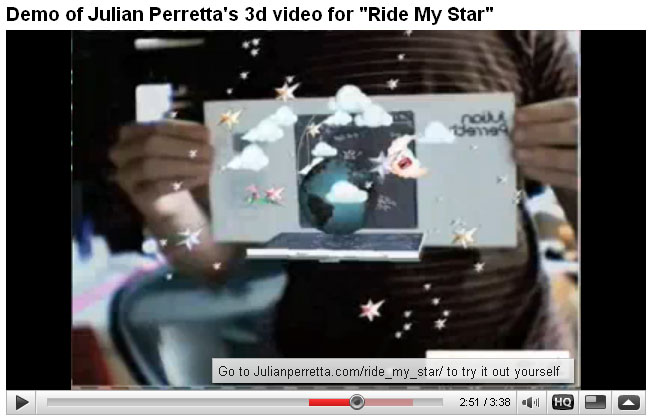 Pe julianperretta.com/ride_my_star puteti lua parte la desfasurarea in augmented reality a noului videoclip al lui Julian Peretta. Universul versurilor "Ride my star" este infatisat direct pe foaia pe care o tineti in fata webcamului si pe care o puteti misca in ritmul muzicii (demo).
