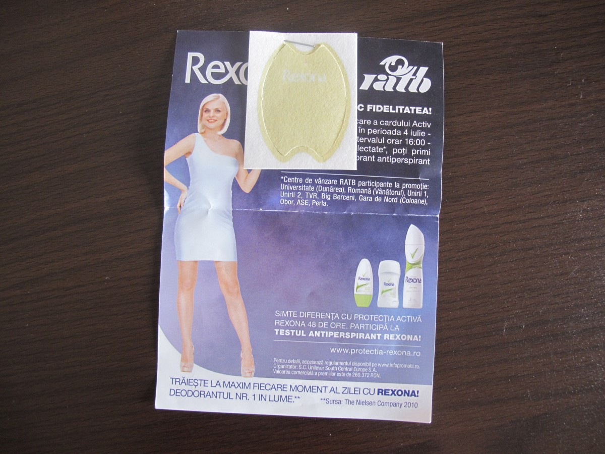 Adicatelea, Rexona ne spune nu prea delicat ca e nevoie de mai mult de cantitate normala de deodorant in zilele de vara, cand calatorim cu autobuzul. Drept pentru care primim la fiecare reincarcare (in intervalul de mai sus) a cartelei un roll-on Rexona, ca sa ne mai dam si noi cu si mai mult deodorant. Poate la urmatoarele reincarcari primim si un sapun, un gel de dus si pudra de talc si putem intregi pachetul de supravietuire a "Transpiratului de RATB”. Bon. Desi, trebuie sa recunosc, sunt femei care chiar ar trebui sa aiba in geanta un deodorant in miniatura, mai ales in autobuz.