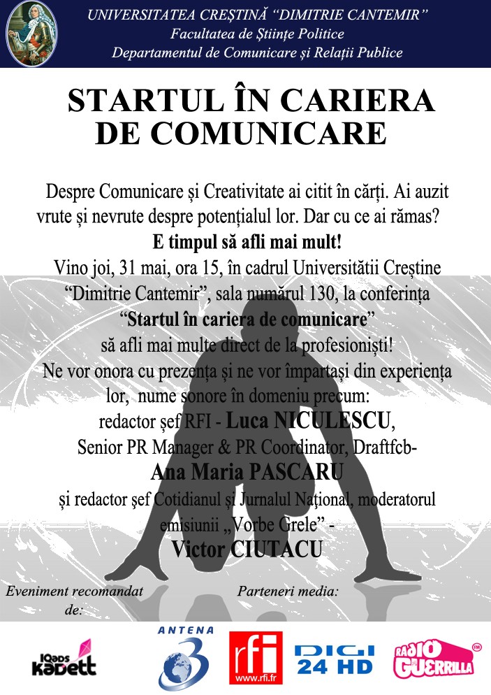 Un grup de studenti la Comunicare si Relatii Publice, anul II, din cadrul Universitatii Crestine Dimitrie Cantemir, organizeaza pe 31 mai conferinta "Startul in cariera de comunicare". Aceasta isi propune sa prezinte pasii ce trebuie parcursi la inceput de drum in acest domeniu.