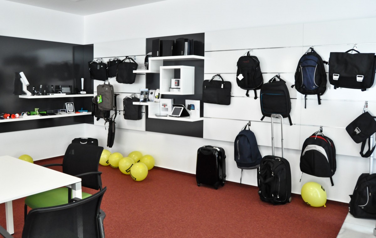 Prima sectiune pe care o vezi cand intri este cea de mape si produse de birotica, care pot fi toate personalizate prin policromie, print direct sau tampografie. Langa sectiunea de birotica asteapta sa fie privita cea de mug-uri, flusk-uri si articole sport. „Aici a fost mai greu sa le grupam, dar cred ca am reusit pana la urma sa le dam un sens, desi sunt destul de variate produsele. De exemplu, avem acest set de coarda, cantar, pedometru de la un furnizor, si acest set de stop watch-uri este de la alt furnizor”, spune Diana. Turul continua cu prezentarea sectiunii de cani cu diferite particularitati, urmata de zona „end of year gifts”, adresata mai mult clientilor business, care include produse de catalog precum seturi pentru vin.