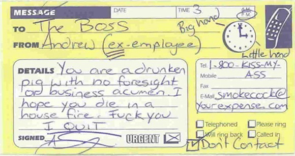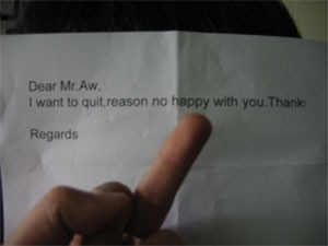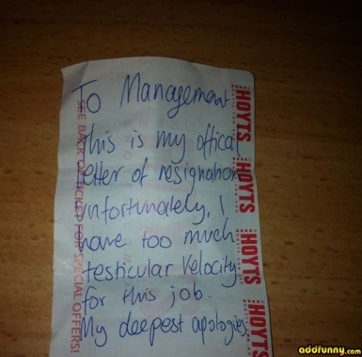 Revenind totusi la nevoia oamenilor de a-si anunta demisiile si de a demonstra ceva in acelasi timp, m-am intrebat cati alti oameni au fost pusi in pozitia Marinei si s-au gandit sa dea sefilor un ultim feedback impreuna cu scrisoarea de adio. Despartiri dramatice sunt multe, asa cum sunt si oameni care au hotarat sa-si adune creativitatea intr-un ultim zvac, inainte sa inchida definitiv usa. Dansuri, cantece, poezii, haiku-uri, toate au ajuns la un moment dat instrumente in mainile oamenilor care si-au spus: "Gata, pana aici". Am adunat cateva dintre cele mai amuzante in galeria de mai jos.