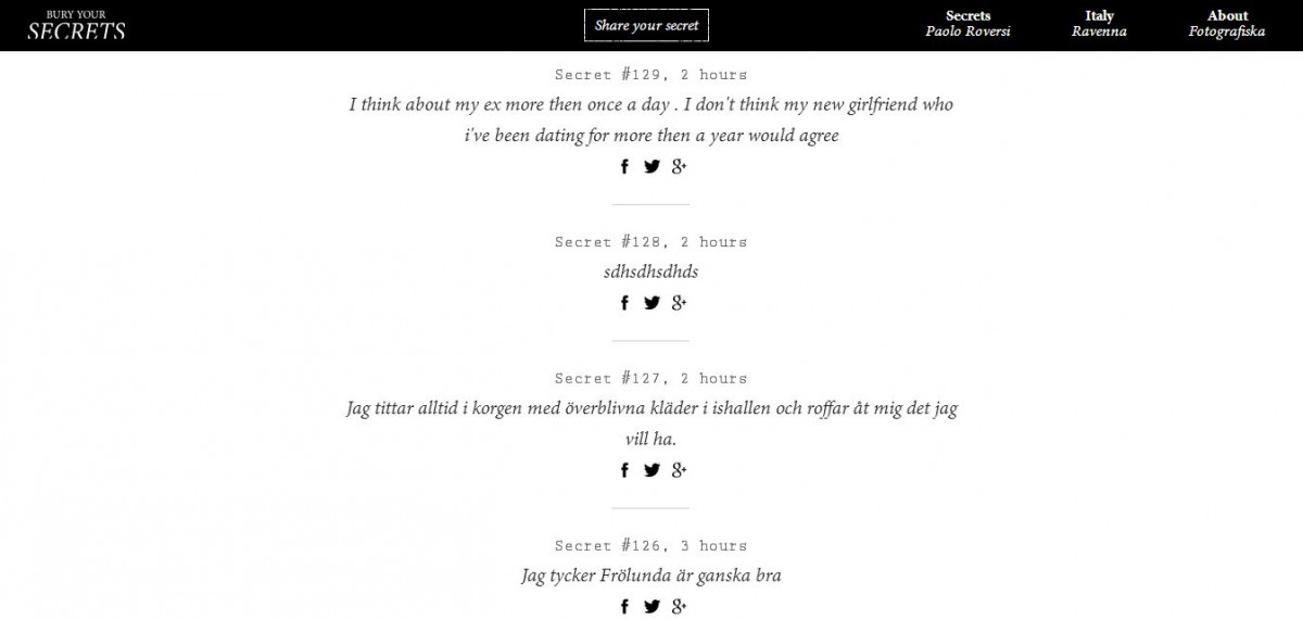 Conceptul are o dimensiune curativa, implicand destainuirea secretului online. Dupa ce, sub anonimitate, ai scapat de povara, secretul tau va fi printat si apoi ingropat in Ravenna, locul de nastere al fotografului. Momentul ales este primvara lui 2014, metaforic moment al renasterii, la o luna dupa terminarea expozitiei din Stockholm: