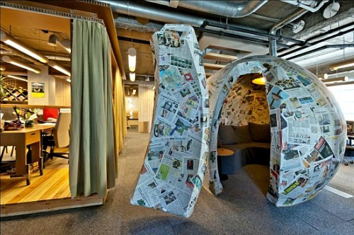 Daca citatele inspirationale scrise pe pereti erau previzibile, nu ma asteptam sa vad, de exemplu, o nava spatiala acoperita in ziare si transformata in camera de relaxare. Cred ca pe nimeni n-ar deranja sa-si petreaca ziua acolo, chiar si noaptea daca e nevoie. Cine a spus ca statul peste program nu e distractiv?