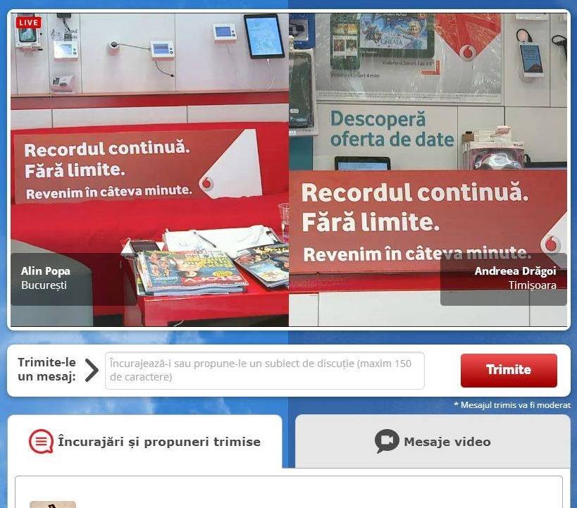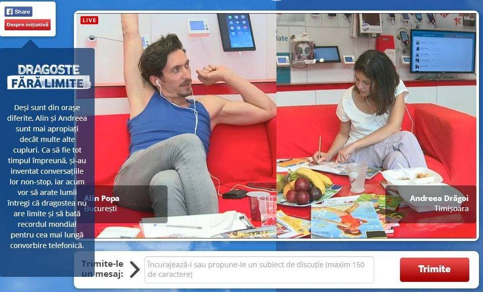 Alin si Andreea se afla fiecare in ceea ce par sa fie doua magazine Vodafone diferite si sunt filmati in timp ce vorbesc la telefon. Puteti urmari live discutia celor doi aici, unde le puteti trimite si incurajari sau sugera subiecte de discutie. Nu va temeti, nu e mai plictisitoare decat unele matinale de la radio, desi e o discutie despre nimicuri obisnuite, cum avem cu totii cand ne plictisim. Eu am intrat pe frecventa cand cei doi vorbeau deja de vreo trei ore si i-am prins desenand. Andreea il desena pe Alin, iar Alin ii desena masina Andreei. Tinerii au mai vorbit despre joburile pe care le-au avut, despre cum ar fi sa-si faca propria lor afacere, iar chiar in timp ce scriu eu, tipul ii explica tipei cum functioneaza roaba.