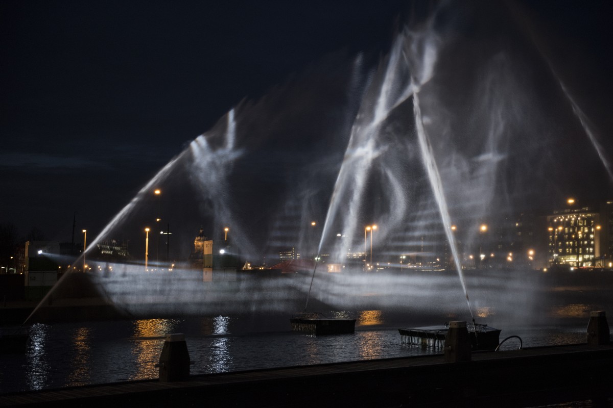 Dupa ce am primit vestea cea mare si am semnat 'Artist's Agreement', am inceput sa cautam solutii tehnice pentru generarea ecranului de apa. Optiunea cea mai buna, hydroshield, nu incapea in buget, asa ca am ales sa lucram cu jeturi de apa. Am avut trei oferte, de la firme din Olanda, Austria si Romania. Impreuna cu organizatorii ALF, am selectat firma austriaca, Eventtechnik.