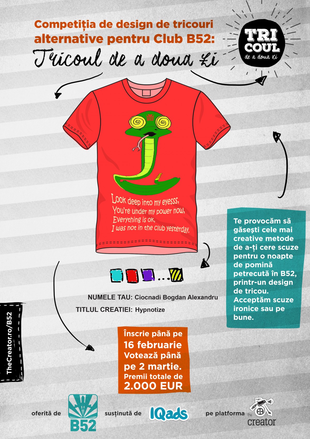 Suntem siguri ca ti-au trecut si tie prin minte cateva idei de tricou de a doua zi, asa ca asteptam propunerile tale pana pe 16 februarie. Pentru mai multe detalii despre competitie, te vor ajuta brieful oficial si regulamentul competitiei. Citeste-le cu atentie.