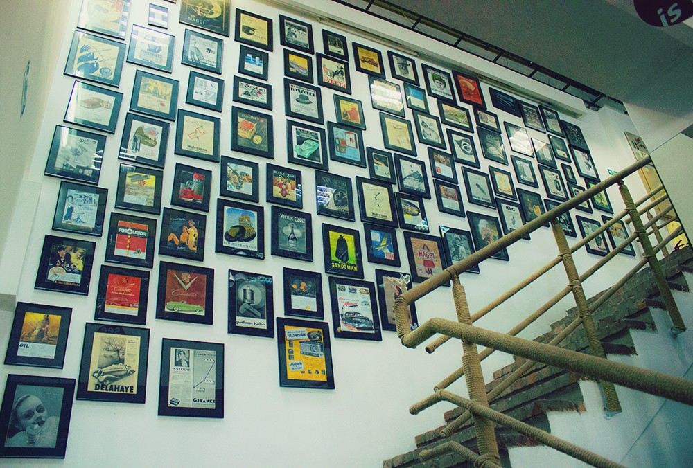 Pe partea dreapta, cum urci scarile, ochii iti aluneca pe colectia de reclame vechi, un spatiu care spune nu o poveste, ci mai multe.