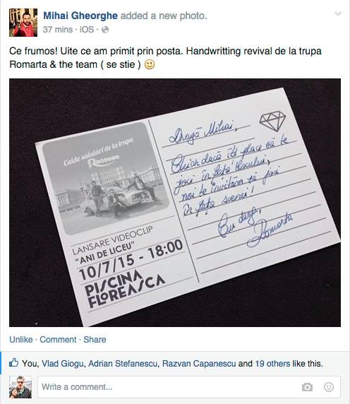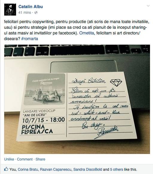 Capii organizatiei responsabile? Membrii formatiei Romarta, care plonja indraznet prin newsfeed-urile oricarui om din si de pe langa marcomm la inceputul lunii iulie, gratie unei campanii ce implica invitatii personalizate, scrise de mana ordonat, cu "font" scolaresc; te chemau sa vii la piscina. Cine a reusit sa opuna rezistenta, sa ne scrie.