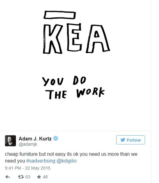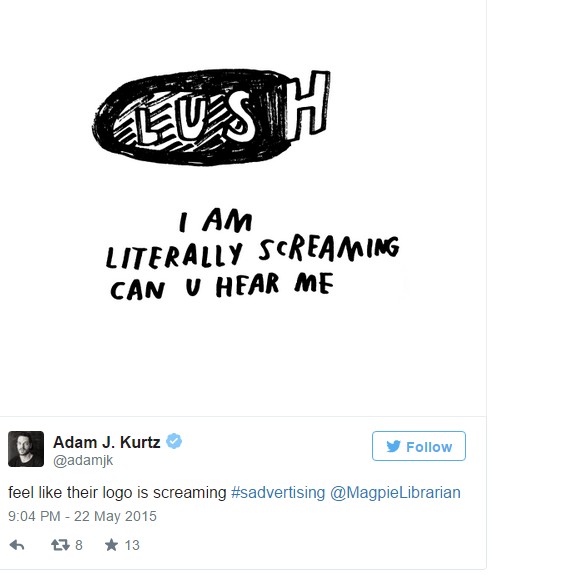 Si pentru ca exista Twitter, Kurtz nu a tinut epifania doar pentru el. La cerintele publicului, el a desenat, in cateva ore, o galerie de logo-uri triste. De la Nike si Coca Cola, la Ikea si aproape Starbucks.