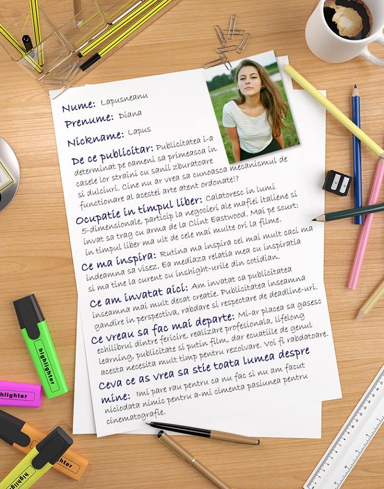 Ne sta in obicei ca la finalul stagiului sa evaluam studentii, proiectul si pe noi. Asa s-a intamplat si cu Diana Lapusneanu, care ca orice Lapusneanu’ ne-a convins exclamand: „Daca voi nu ma vreti, eu va vreau!” Si uite asa am continuat colaborarea. Mai multe despre Diana, ne spune chiar ea.