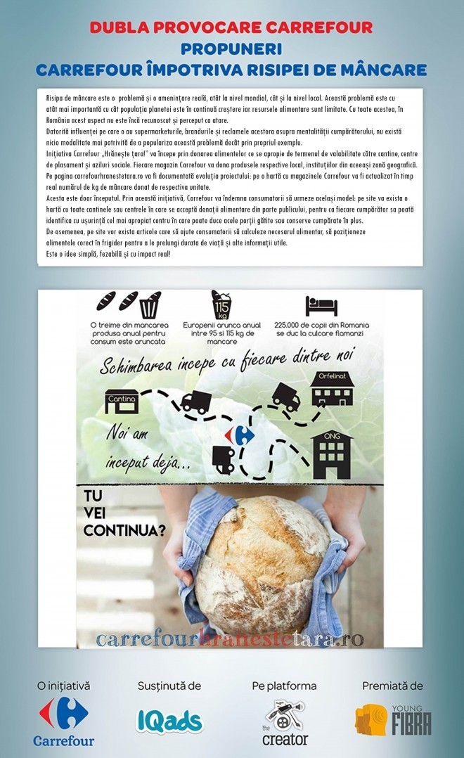 Avand in vedere ca de la inceputul acestui an supermarketurile din Franta sunt obligate sa doneze alimentele aproape de data expirarii, mi s-a partut foarte potrivit ca brandul sa adopte si sa popularizeze aceasta actiune si in Romania, chiar daca aici nu are aceasta obligatie legala.