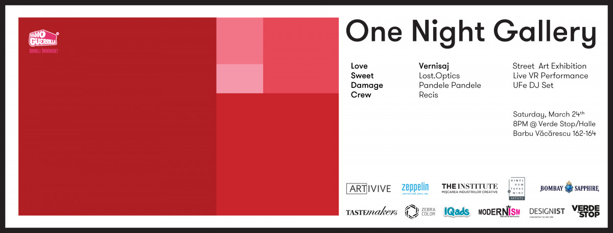 Partenerii One Night Gallery #3 sunt Tastemakers, Bombay Sapphire, Verde Stop, ArtiVive, WRTV Artists, Zebra Color, IQads, The Institute, Designist, Zeppelin, Modernism.