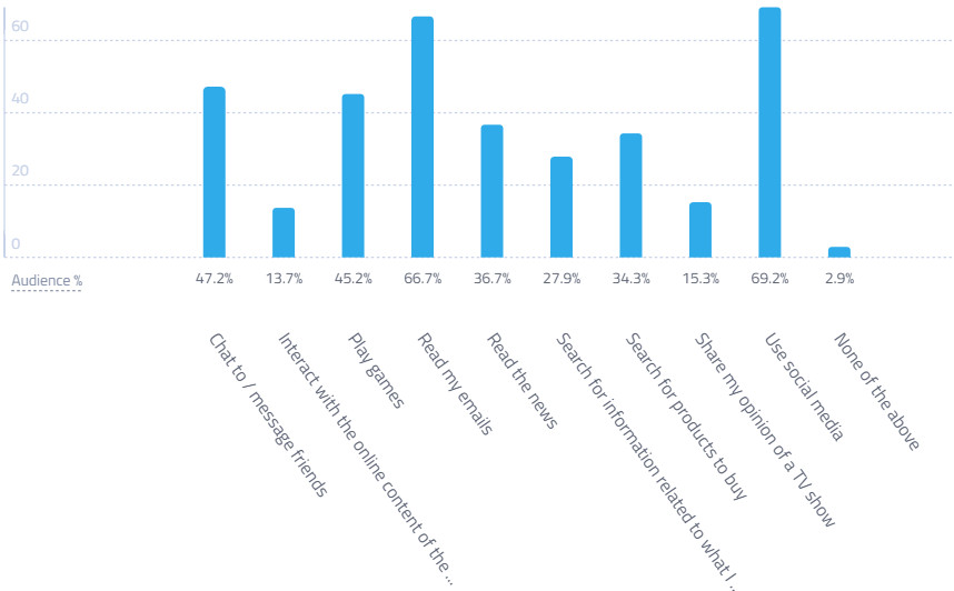 Totodată, în ceea ce privește consumul de media, studiul relevă că 84% dintre românii conectați folosesc telefoanele mobile pentru a socializa sau pentru a-și verifica e-mailul în timp ce se uită la televizor. Și cu toate că 66% dintre cei intervievați declară că sunt interesați de filme, doar 41% se uită pe YouTube la trailere și doar 24% au un cont de Netflix (deși 40% spun că se uită la conținut pe Netflix, deoarece un cont poate fi împărțit de mai mulți utilizatori). Netflix este cea mai populară platformă de VOD pentru filme.
