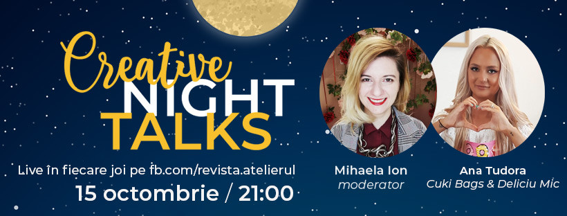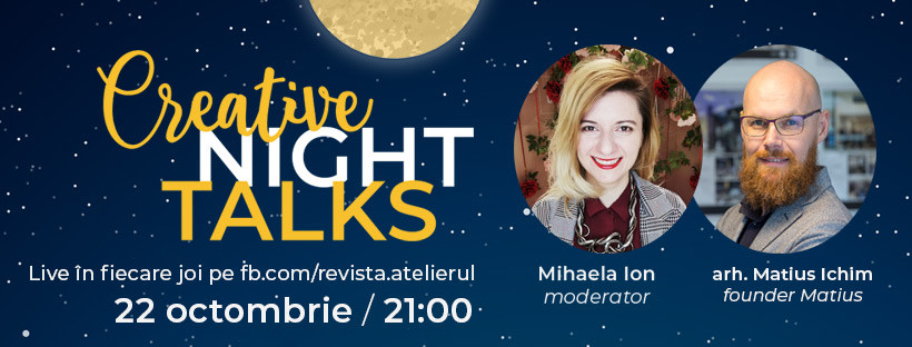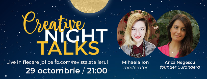 Seria de conferinţe Creative Night Talks – proiect implementat de Revista Atelierul, moderatoare Mihaela Ion continuă în forţa în luna octombrie, în fiecare joi seara de la 21.00 la 22.00, pe facebook Revista Atelierul. Sunt dezbătute subiecte de actualitate din cadrul industriilor creative şi culturale, astfel pe 8 octombrie invitată este Carmen Dumitrescu, conferenţiar universitar doctor la Universitatea de Arhitectură Ion Mincu, pe 15 octombrie ne întâlnim cu Ana Tudora – creator de produs, pe 22 octombrie ne reîntoarcem atenţia asupra arhitecturii din România şi îl invităm pe arh. Matius Ichim, iar pe 29 octombrie povestim cu Anca Negescu despre statusul bijuteriei internaţionale.