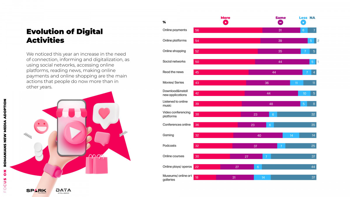 În ultimul an a crescut nevoia de conectare și informare, conform studiului New Media Adoption, realizat de agenția de media Spark Foundry, membră Publicis Groupe România. Românii au folosit mediul online într-o mai mare măsură în ultimele 12 luni comparativ cu anii anteriori: au fost mai prezenți pe platforme (54%) și rețelele sociale (50%) și au făcut mai multe plăți (56%) și cumpărături online (52%). Izolarea și evenimentele fără precedent i-au determinat, în același timp, să citească mai frecvent știri (45%) și să se uite mai des la filme și seriale (43%). Noul studiu face parte din Focus On: New Media Usage, o serie de rapoarte trimestriale care vor urmări evoluția comportamentelor de consum media, bazate pe studii cantitative.