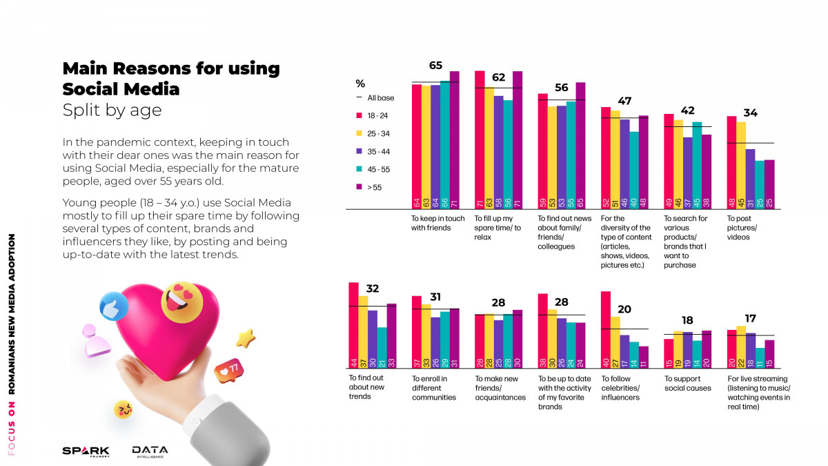 În schimb, tinerii (18-34 de ani) folosesc social media mai ales pentru a-și umple timpul liber (67%), urmărind mai multe tipuri de conținut, branduri și influenceri, fiind la curent cu ultimele tendințe și postând la rândul lor.
