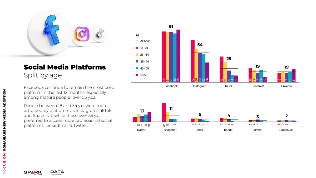 Facebook continuă să fie cea mai populară platformă social media, folosită de toate grupele de vârstă, cu o acoperire de 91%, și mai ales de către persoanele de peste 55 de ani (95%). Tinerii cu vârste între 18 și 34 de ani sunt mai atrași de platforme precum Instagram, TikTok și Snapchat, în timp ce persoanele de peste 55 de ani preferă să acceseze platforme sociale folosite în scop profesional, precum LinkedIn și Twitter.