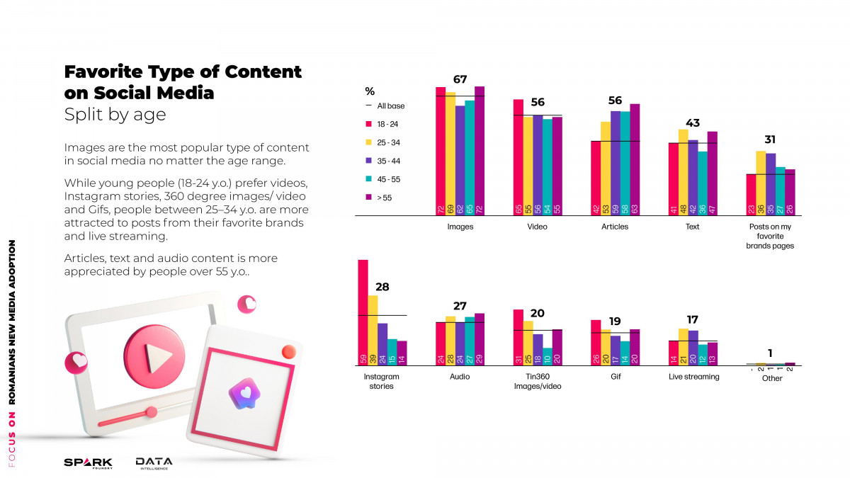 Imaginile sunt cel mai popular tip de conținut din social media pentru toate segmentele de vârstă, cu o acoperire de 67%. În timp ce tinerii (18-24 ani) preferă videoclipuri (65%), stories pe Instagram (59%), imagini 360 grade (31%) și GIF-uri (26%), persoanele cu vârste cuprinse între 25-44 ani sunt mai atrase de postările brandurilor lor preferate (36%) și de live streaming (21%).