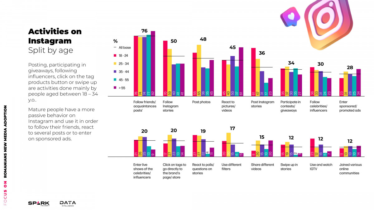 Tinerii (18-34 de ani) postează, participă la concursuri și urmăresc influenceri pe Instagram. În paralel, persoanele mature au un comportament mai pasiv și folosesc platforma pentru a-și urmări prietenii, pentru a reacționa la postări sau pentru a intra pe reclame sponsorizate.