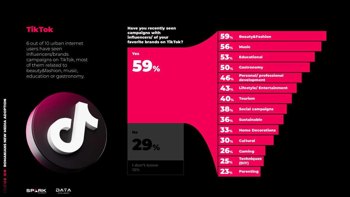 6 din 10 utilizatori de internet din mediul urban au văzut recent campanii derulate de influenceri sau branduri pe TikTok, majoritatea legate de frumusețe și modă (59%), muzică (56%), educație (53%) sau gastronomie (50%). Platforma rămâne populară în rândul tinerilor cu vârste cuprinse între 18 și 24 ani (47%) și 25 și 34 ani (37%).