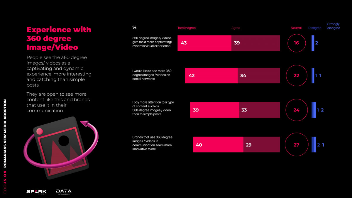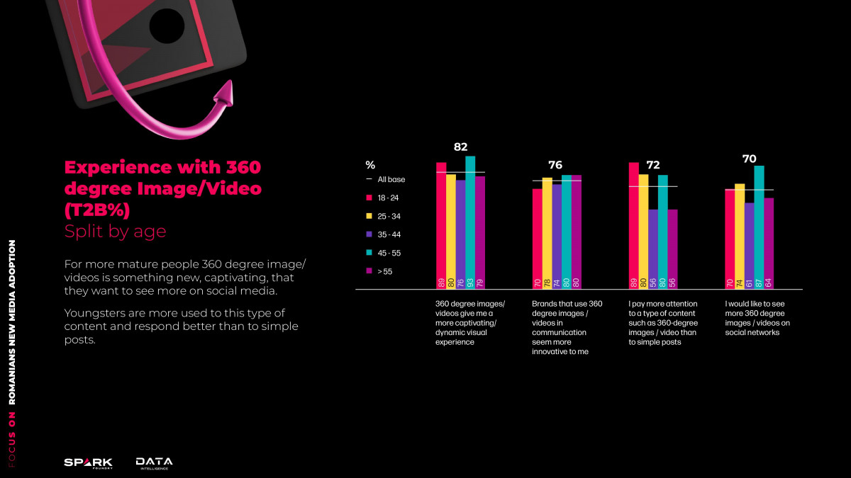 Românii consideră imaginile și videoclipurile 360 de grade o experiență captivantă și dinamică. Tinerii sunt mai familiari cu acest tip de conținut, la care răspund mai bine decât la postările simple, aproape 90% dintre cei cu vârsta cuprinsă între 18 și 24 de ani declarând că acordă mai multă atenție imaginilor și videoclipurilor 360 de grade.