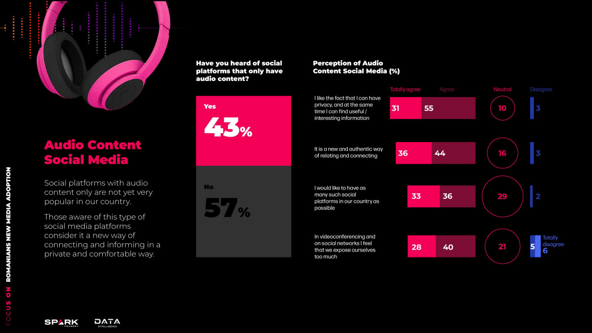 Platformele care au exclusiv conținut audio nu sunt încă foarte populare printre români. Cei familiarizați cu acest tip de platforme le accesează pentru a se conecta cu alte persoane și a se informa, într-un mod privat și confortabil (80%).