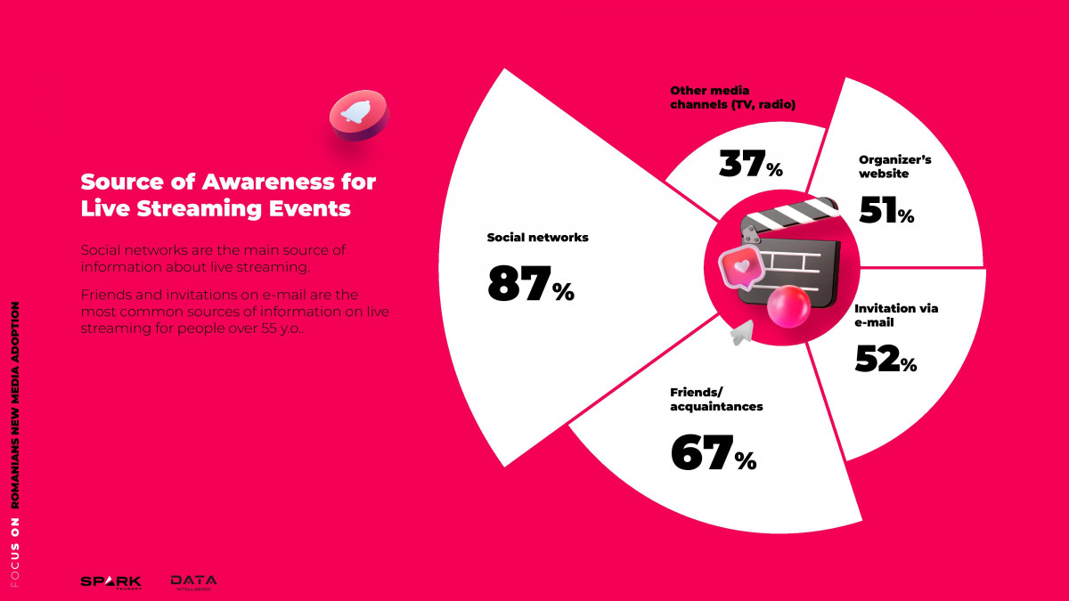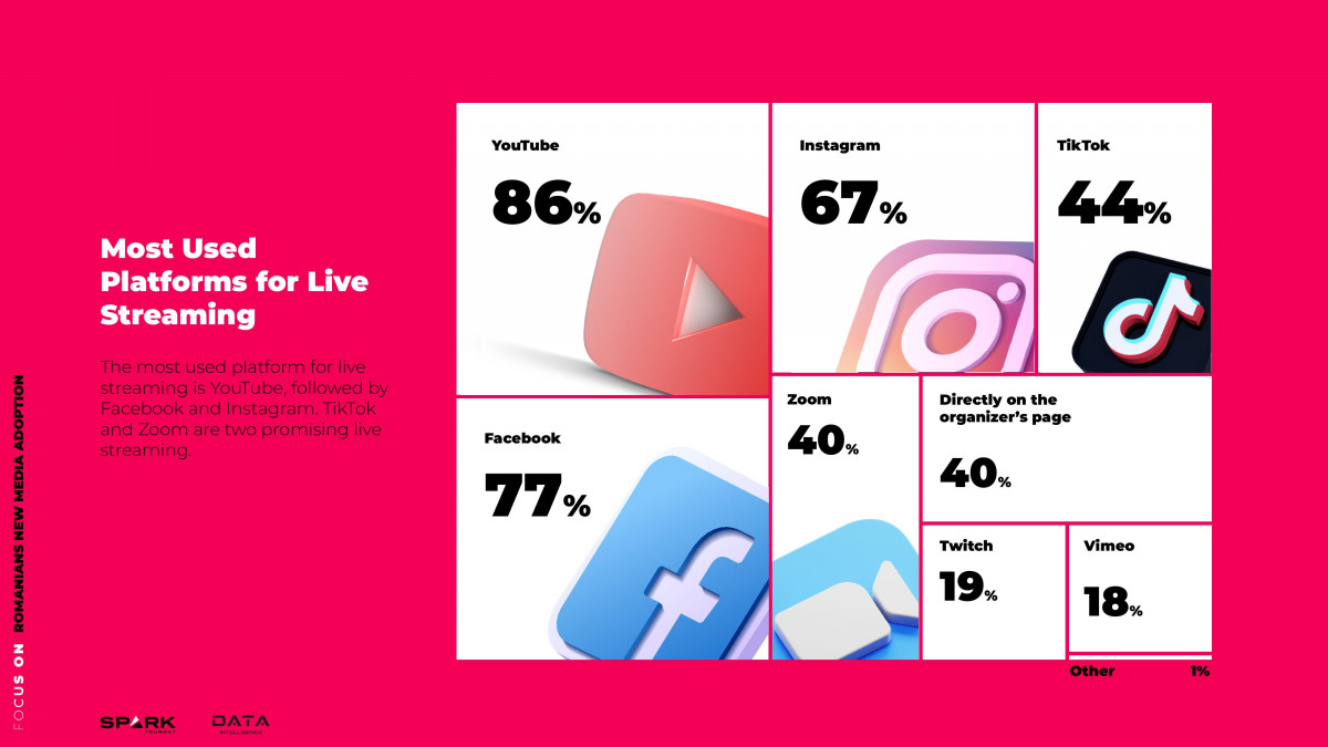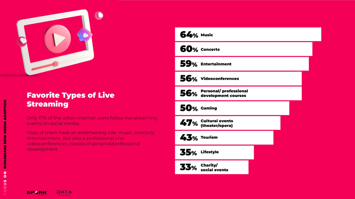 Doar 17% dintre utilizatorii de internet din mediul urban urmăresc live streaming pe rețelele de socializare. Majoritatea acestora le folosesc pentru divertisment (muzică, concerte) dar și în scopuri profesionale: videoconferințe, cursuri de dezvoltare personală și profesională. Cele mai folosite platforme pentru live streaming sunt Youtube (86%), Facebook (77%) și Instagram (67%).