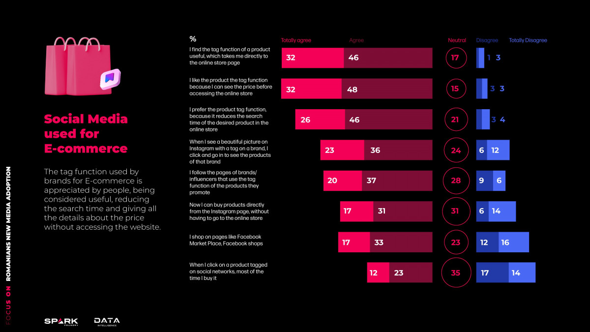 Funcția de etichetare folosită de branduri pentru comerțul electronic este apreciată de utilizatorii români de internet, fiind considerată utilă pentru că reduce timpul de căutare a produsului (72%) și oferă toate detaliile despre preț, fără a fi nevoie de a accesa site-ul web (80%). Cu toate acestea, doar 35% dintre ei cumpără produsele promovate în acest fel, atunci când le întâmpină etichetate.