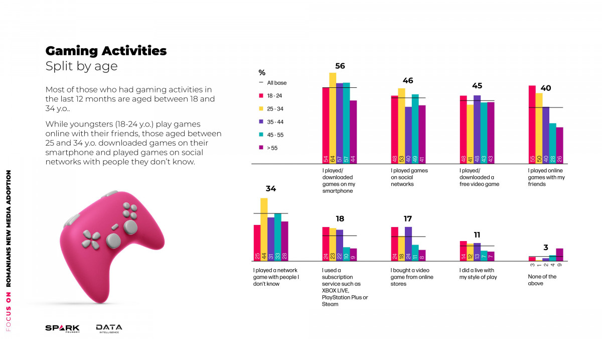 Majoritatea celor care au întreprins activități de gaming în ultimele 12 luni sunt tineri. În timp ce segmentul de vârstă 18-24 ani se joacă online cu prietenii (55%), persoanele cu vârste cuprinse între 25 și 34 de ani preferă să descarce jocuri pe smartphone sau să acceseze jocuri pe rețelele de socializare (64%).