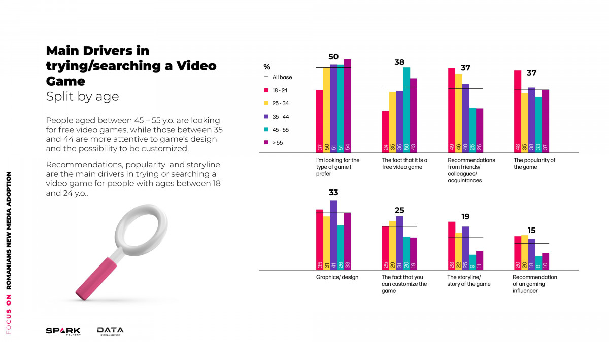 Persoanele cu vârste cuprinse între 45-55 de ani caută jocuri video gratuite (50%), iar cele între 35 și 44 de ani sunt mai atente la designul jocului (41%) și la măsura în care poate fi personalizat (31%).