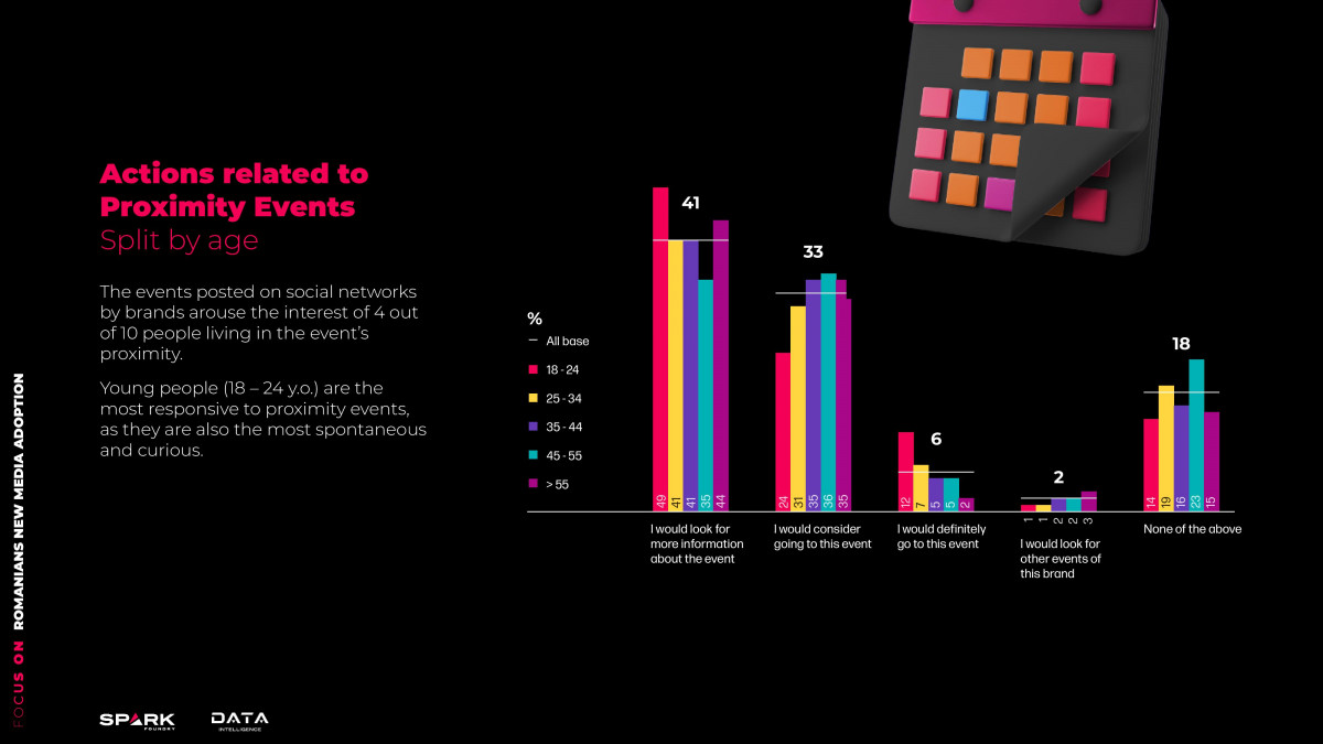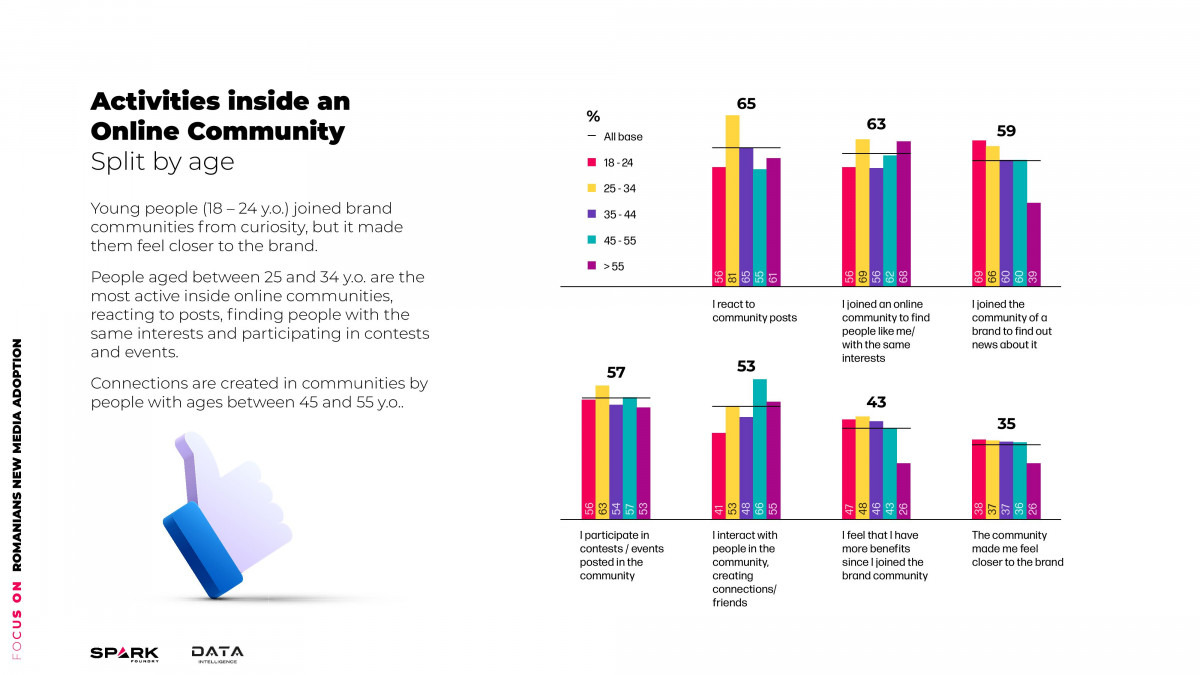Segmentul de vârstă 25-34 de ani este cel mai activ în comunitățile online ale brandurilor: reacționează la postări, caută persoane cu aceleași interese și participă la concursuri și evenimente. În schimb, conexiunile și prieteniile sunt legate în comunități de către persoanele cu vârste cuprinse între 45 și 55 de ani.