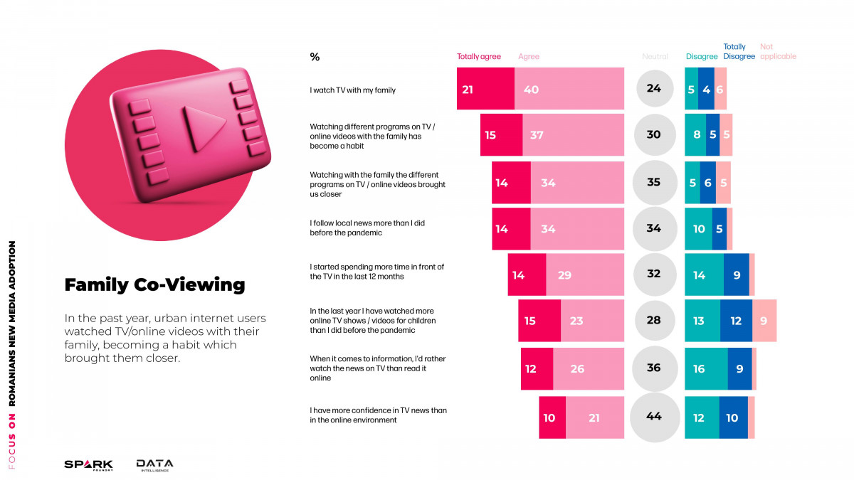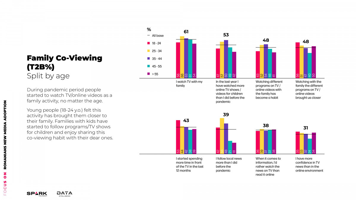 61% dintre respondenții studiului se uită la TV alături de familie, iar 38% dintre ei au mărturisit că în ultimul an au urmărit programe TV sau online alături de familie într-o măsură mai mare comparativ cu alți ani.