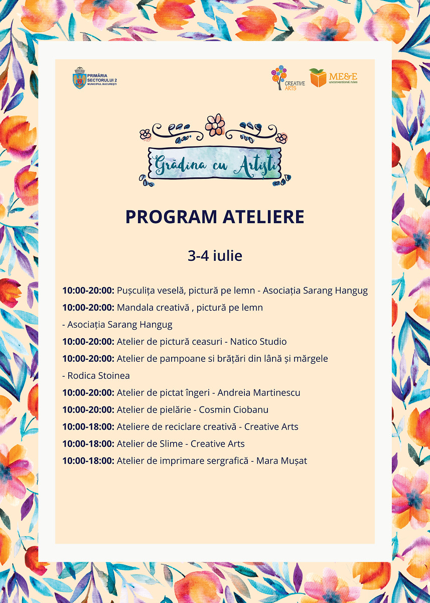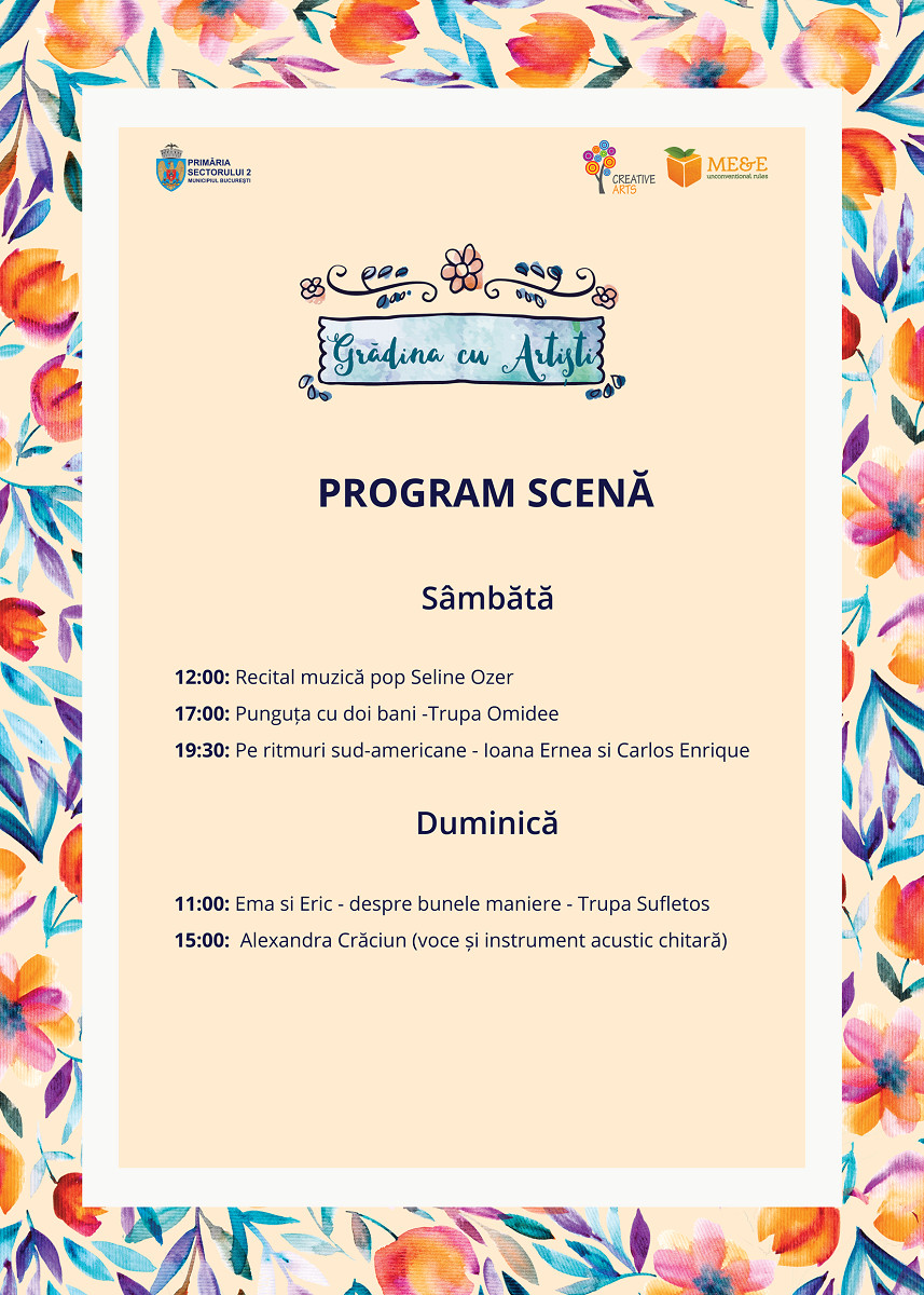 Din programul ediției din iulie a Grădinii cu Artiști sunt de neratat piesele de teatru Punguța cu doi bani, cu trupa Omidee, de sâmbătă, 3 iulie, ora 17:00 și Ema și Eric – despre bunele manière, cu trupa Sufletos, după cartea Ioanei Chicet – Macoveiciuc, de duminică, 4 iulie, ora 11:00 și concertul Pe ritmuri sudamericane, cu Ioana Ernea și Carlos Enrique, de sâmbătă, de la ora 19:30.
